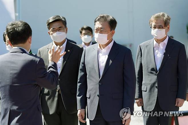 (서울=연합뉴스) 문재인 대통령이 15일 국방과학연구소 안흥시험장에서 미사일전력 발사 시험 참관에 앞서 관계자로부터 장거리 공대지미사일에 대한 설명을 듣고 있다. 2021.9.15 [청와대 제공. 재판매 및 DB금지]