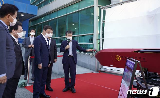(서울=뉴스1) 유승관 기자 = 문재인 대통령이 15일 국방과학연구소 안흥시험장에서 미사일전력 발사 시험을 참관하기 앞서 장거리 공대지미사일에 대한 설명을 듣고 있다. (청와대 제공) 2021.9.15/뉴스1