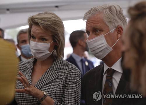 epa09469266 Belgium's King Philippe (R) and Queen Mathilde (C) speak with locals during a visit to people who were affected by the July 2021 floods, in Enzival, Vervier, Belgium, 15 September 2021. Heavy rainfalls in July had caused widespread damage and flooding in parts of Belgium, the Netherlands and western Germany. EPA/OLIVIER HOSLET