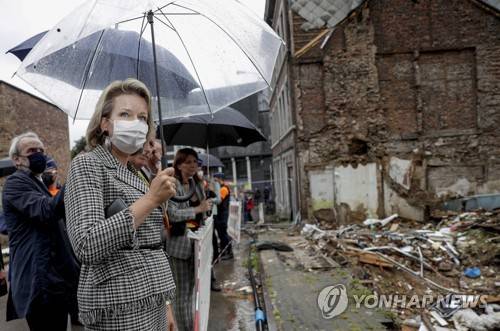 epa09469269 Belgium's Queen Mathilde (L) look at damaged buildings during a visit to people who were affected by the July 2021 floods, in Enzival, Vervier, Belgium, 15 September 2021. Heavy rainfalls in July had caused widespread damage and flooding in parts of Belgium, the Netherlands and western Germany. EPA/OLIVIER HOSLET