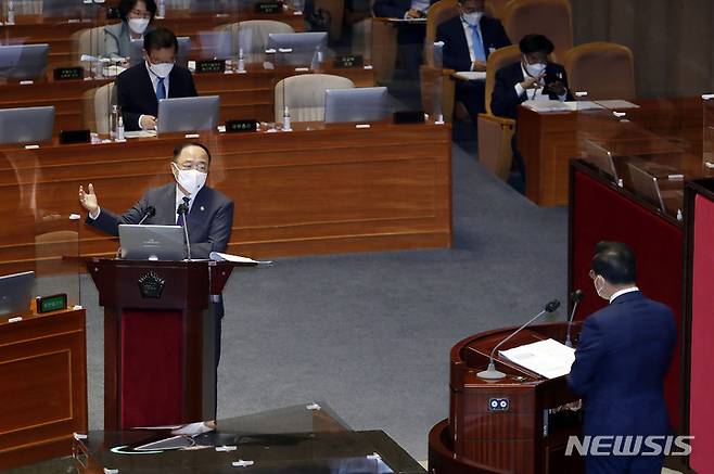![[서울=뉴시스] 최진석 기자 = 15일 국회 본회의에서 열린 경제 분야 대정부 질문에서 홍남기 경제부총리 겸 기획재정부 장관이 의원 질의에 답하고 있다. (공동취재사진) 2021.09.15. photo@newsis.com](https://img1.daumcdn.net/thumb/R658x0.q70/?fname=https://t1.daumcdn.net/news/202109/15/newsis/20210915185634890scxb.jpg)