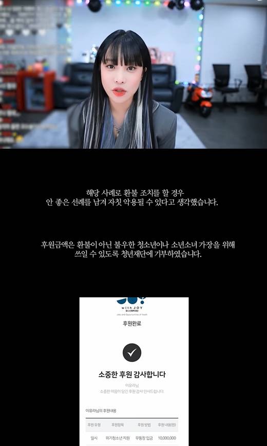 이어 "더불어 랄랄 씨는 그 미성년 후원인이 환불 조치가 됐다는 사실을 알면 안되는 부분과, 자신의 유튜브 방송에서도 전했듯, 환불 조치를 취한 일이 밝혀졌을 경우 좋지 않은 선례로써 악용될 수 있음을 염려해 왔습니다. 따라서 기사화되기를 원하지 않았으나 일련의 과정이 사실과 다르게 알려져 이렇게 랄랄 씨의 입장을 전합니다"고 설명했다.