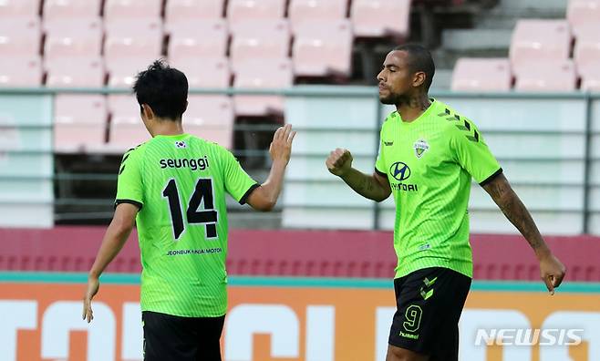 [전주=뉴시스] 김얼 기자 = 아시아축구연맹 챔피언스리그(ACL) 16강전 전북현대모터스와 BG빠툼유나이티드(태국)의 경기가 열린 15일 전북 전주시 전주월드컵경기장에서 전북현대모터스 구스타보 선수가 골을 성공시키고 세리머니를 하고 있다. 2021.09.15. pmkeul@newsis.com