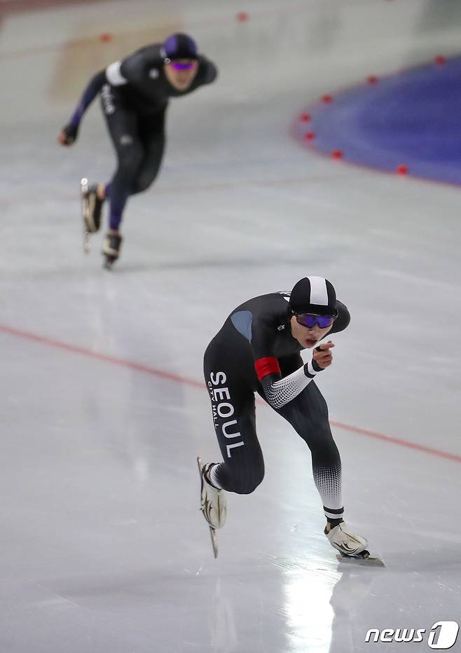 (서울=뉴스1) 안은나 기자 = 15일 서울 노원구 태릉국제스케이트장에서 열린 SK텔레콤배 제56회 전국남녀 종목별 스피드스케이팅 선수권대회 남자 5000m 결승에서 정재원(서울시청)과 이승훈(서울일반)이 역주하고 있다. 정재원은 6분37초36의 기록으로 1위를 차지했다. 2021.9.15/뉴스1