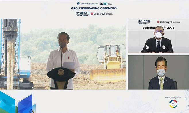 | 온라인 기공식행사 15일 인도네시아에서 진행된 현대차그룹과 LG에너지솔루션의 배터리셀 합작공장 기공식 행사 중 조코 위도도 인도네시아 대통령(왼쪽)이 현장에서 축하 인사말을 하고 있다. 정의선 현대차그룹 회장(오른쪽 위)이 서울 서초구 양재동 현대차그룹 사옥에서 온라인 화상 연결을 통해 참석하고 있다. 김종현 LG에너지솔루션 사장도 서울 영등포구 여의도 본사에서 화상 연결을 통해 참석하고 있다. 현대차그룹 제공 |