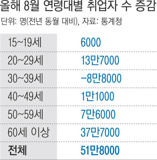 제조업의 고용 감소는 30대 취업자 수에도 영향을 미쳤다. 연령별로 취업자는 60세 이상 37만7000명, 20대 13만7000명, 50대 7만6000명, 40대 1만1000명이 각각 증가했지만, 30대 취업자만 유독 8만8000명 줄었다. 30대 취업자는 18개월 연속 감소세의 늪에 빠져 있다. 구직활동도 가사일도 하지 않고 집에서 시간을 보냈다고 응답한 ‘쉬었음’ 인구도 30대와 60대만 각각 1만9000명, 2만3000명 증가했다.