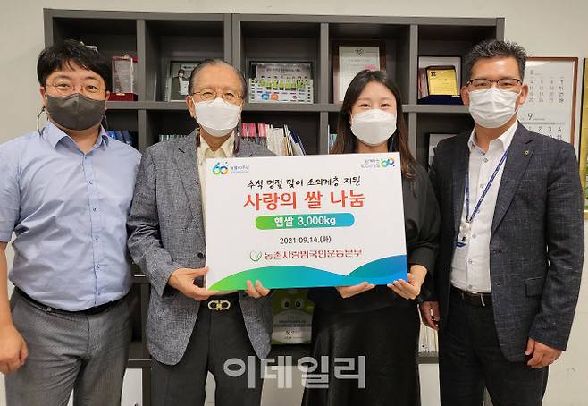 [이데일리 김태형 기자] 농촌사랑범국민운동본부(대표 정영일, 왼쪽 두번째)는 추석을 앞두고 지역별로 선정된 보육원, 요양원 등 취약계층시설 15곳에 햅쌀 3,000kg을 전달하는 등 우리농산물 나눔행사를 개최했다고 15일 밝혔다.