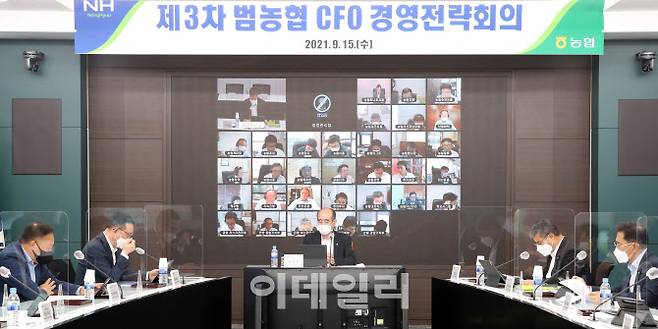 유찬형(가운데) 농협중앙회 부회장이 15일 서울 중구 농협중앙회 본관에서 화상회의시스템으로 개최된 '2021년 제3차 범농협 CFO 경영전략회의' 계열사 최고재무책임자들과 대화하고 있다.