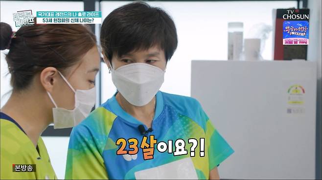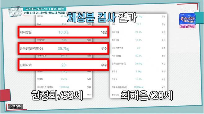 현재 현정화의 몸무게는 42.5kg. 체지방률 10%에 근육량 35.7kg로 53세 실제 나이보다 30살이나 어린 23세 신체 나이가 증명됐다. 현정화는 "딸이 20대다. 저도 말이 안된다고 생각해요"라며 웃었다.