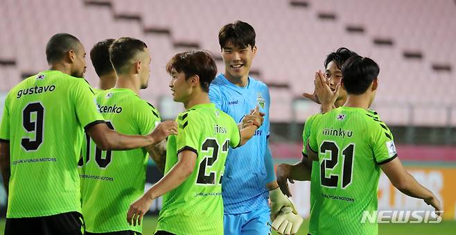 [전주=뉴시스] 김얼 기자 = 아시아축구연맹 챔피언스리그(ACL) 16강전 전북현대모터스와 BG빠툼유나이티드(태국)의 경기가 열린 15일 전북 전주시 전주월드컵경기장에서 전북현대모터스 송범근 선수가 승부차기 2개의 슛을 막아내고 동료들에게 축하를 받고 있다. 2021.09.15. pmkeul@newsis.com