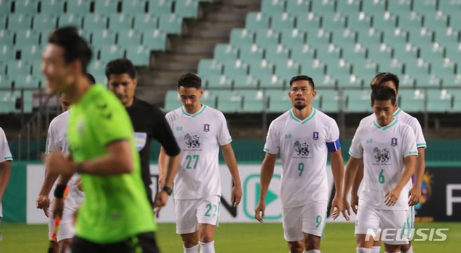 [전주=뉴시스] 김얼 기자 = 아시아축구연맹 챔피언스리그(ACL) 16강전 전북현대모터스와 BG빠툼유나이티드(태국)의 경기가 열린 15일 전북 전주시 전주월드컵경기장에서 연장전과 승부차기 끝에 패배한 BG빠툼유나이티드 선수들이 힘겹게 경기장을 빠져나오고 있다. 2021.09.15. pmkeul@newsis.com