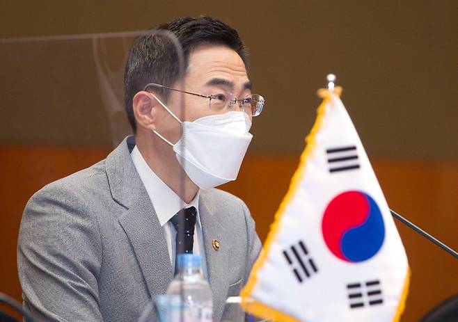 [서울=뉴시스] 조수정 기자 = 용홍택 과학기술정보통신부 제1차관이 15일 오후 서울 중구 롯데호텔에서 쉬크마마토프 알맘벳 나시카노비치(Shykmamatov Almambet Nasyrkanovich) 키르기스스탄 투자부 장관을 만나 면담하고 있다. (사진=과학기술정보통신부 제공) 2021.09.15. photo@newsis.com *재판매 및 DB 금지