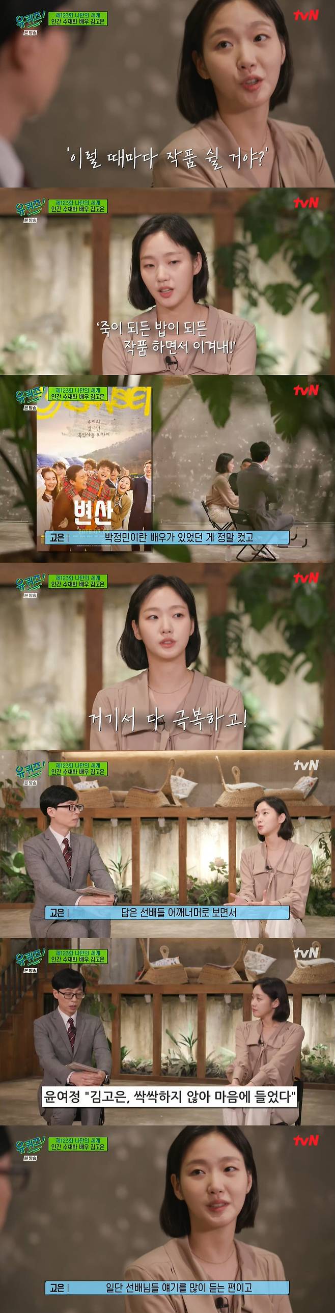 첫 작품 이후 복학했다는 김고은. 그는 "작품은 사람들과 같이 해야하는 작업인데 사람들을 만나는 게 버거울 것 같단 생각이 들더라"면서 "'죽이 되든 밥이 되는 작품 하면서 이겨내!' 스스로 결론을 내린 뒤 영화 '변산'이라는 작품을 했다"고 했다.