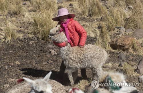 Leila Ccaico, 11, plays with one of her family's alpacas on her family's land in Licapa, Peru, Thursday, Sept. 2, 2021. Ccaico, whose parents are alpaca herders, said she stopped speaking Quechua fluently at the age of six when her older sister told her to stop because passersby would make fun of them. (AP Photo/Franklin Briceno) SEPT. 2, 2021 PHOTO