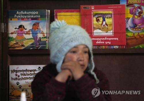 Books written in the Quechua Indigenous language sit behind a student during a class on medicinal plants, at a public primary school in Licapa, Peru, Wednesday, Sept. 1, 2021. Quechua speakers are expecting that Peru’s new government, led by a rural schoolteacher from an Indigenous region, will give their language more visibility and increase funding for bilingual education in villages where children are often reluctant to speak the ancient tongue. (AP Photo/Martin Mejia) SEPT. 1, 2021 PHOTO