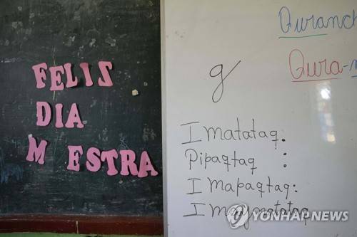 The Spanish phrase "Happy Day Teacher," left, hangs next to a white board of words in the Indigenous Quechua language, during language class at a public primary school in Licapa, Peru, Wednesday, Sept. 1, 2021. More than 1.2 million children receive bilingual education in Spanish and Indigenous languages across Peru, a nation of about 32 million people. (AP Photo/Martin Mejia) SEPT. 1, 2021 PHOTO