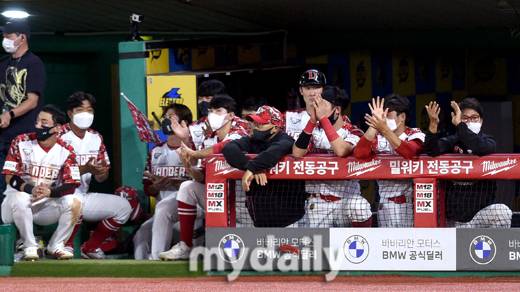 [마이데일리 = 인천 유진형 기자] SSG가 15일 오후 인천 SSG랜더스필드에서 진행된 '2021 신한은행 SOL KBO리그' SSG 랜더스와 한화 이글스의 경기 8회말 추가 2득점을 하자 기뻐하고 있다.