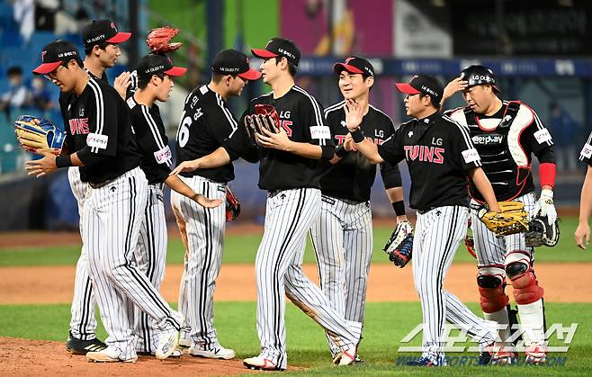 2021 KBO 리그 LG 트윈스와 삼성 라이온즈의 경기가 15일 대구 삼성라이온즈파크에서 열렸다. LG가 5대2로 승리했다. 경기 종료 후 기쁨을 나누는 LG 선수들의 모습. 대구=허상욱 기자 wook@sportschosun.com/2021.09.15/