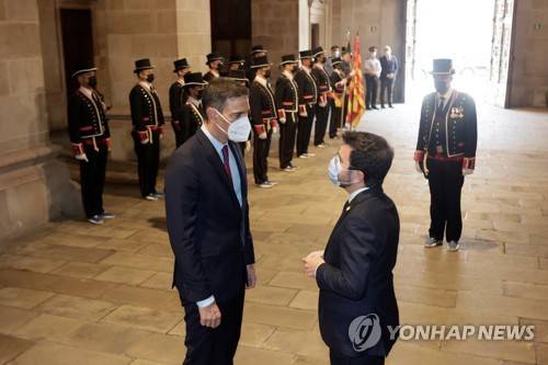 epa09469561 Catalan regional President Pere Aragones (R) welcomes Spanish Prime Minister Pedro Sanchez (L) ahead of their bilateral meeting at Palau de la Generalitat, headquarters of the Catalan regional Government, in Barcelona, Spain, 15 September 2021. EPA/QUIQUE GARCIA