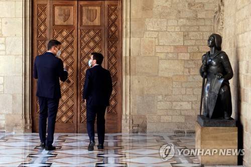 epa09469562 Catalan regional President Pere Aragones (R) welcomes Spanish Prime Minister Pedro Sanchez (L) ahead of their bilateral meeting at Palau de la Generalitat, headquarters of the Catalan regional Government, in Barcelona, Spain, 15 September 2021. EPA/QUIQUE GARCIA
