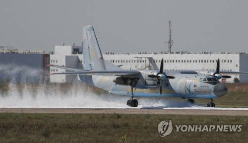 epa09469567 Ukrainian An-26 transport aircraft fulfills the mock crash landing on a foam pillow during the training of Ukrainian rescuers at the International airport Boryspil near Kiev, Ukraine, 15 September 2021. More than 170 rescue workers and 35 units of special machineries took part in the exercise to practice their skills for emergency accidents at an airport. EPA/SERGEY DOLZHENKO