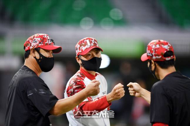 9-6으로 역전승 자축하는 김원형 감독[포토]