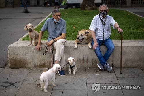 Two men sit with their dogs in a park in Barcelona, Spain, Wednesday, Sept. 15, 2021. (AP Photo/Emilio Morenatti)