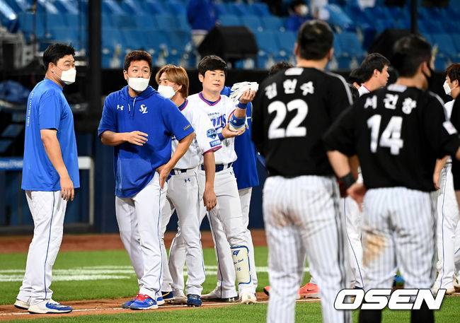경기 종료 후 삼성 라이온즈 선수들이 LG 트윈스 선수들과 인사를 나누고 있다. 2021.09.15 /ksl0919@osen.co.kr