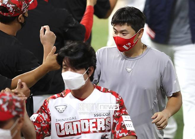 [스포티비뉴스=인천, 곽혜미 기자] 2021 신한은행 SOL KBO리그 SSG 랜더스와 한화 이글스의 경기가 15일 오후 인천 SSG랜더스필드에서 열렸다. 9-6으로 승리한 SSG 최주환이 하이파이브를 하고 있다.