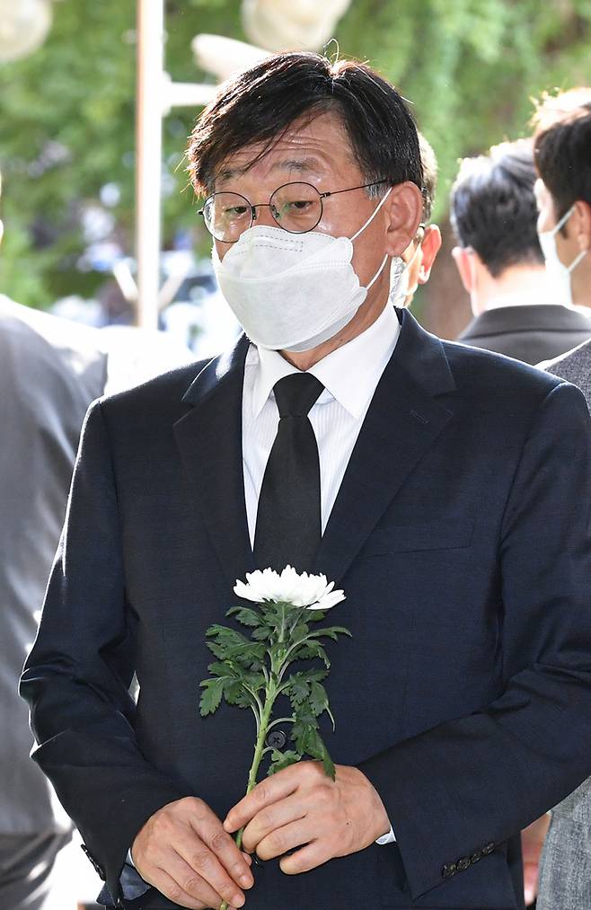 [서울=뉴시스] 조수정 기자 = 김석종 경향신문 사장이 15일 서울 여의도순복음교회 대성전 1층 베다니홀에 마련된 고 조용기 원로목사의 빈소에서 조문을 하고 있다.(사진=국민일보 제공) 2021.09.15. photo@newsis.com *재판매 및 DB 금지