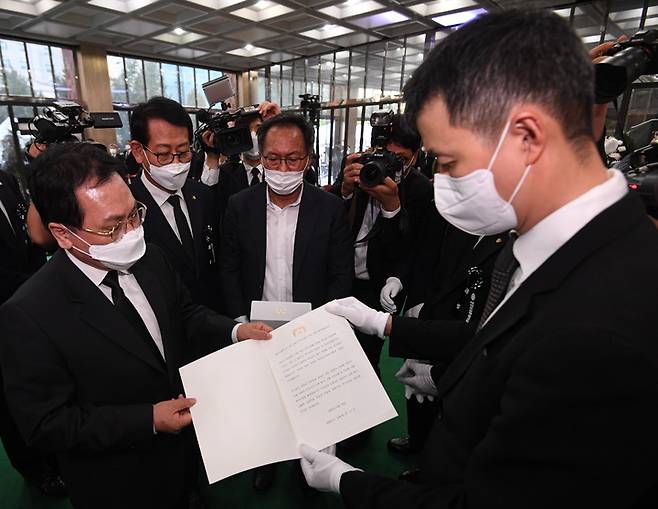 [서울=뉴시스] 조수정 기자 = 유영민 대통령 비서실장이 15일 서울 여의도순복음교회 대성전 1층 베다니홀에 마련된 고 조용기 원로목사의 빈소에서 조문을 마치고 조민제 국민일보 회장에게 문재인 대통령의 조전을 전달하고 있다. (사진=국민일보 제공) 2021.09.15. photo@newsis.com *재판매 및 DB 금지