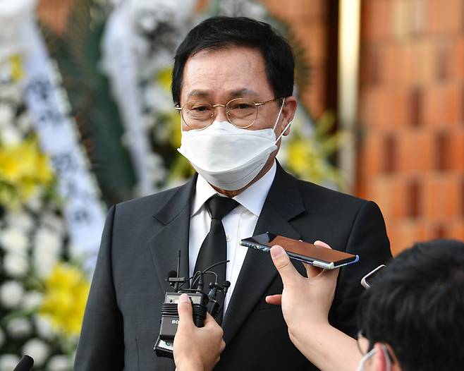 [서울=뉴시스] 조수정 기자 = 유영민 대통령 비서실장이 15일 서울 여의도순복음교회 대성전 1층 베다니홀에 마련된 고 조용기 원로목사의 빈소에서 조문을 마친 뒤 취재진에 답하고 있다. (사진=국민일보 제공) 2021.09.15. photo@newsis.com *재판매 및 DB 금지