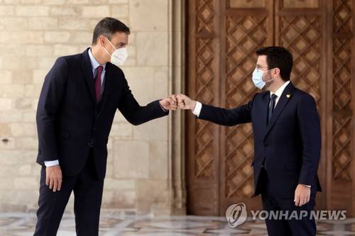 epa09469576 Catalan regional President Pere Aragones (R) welcomes Spanish Prime Minister Pedro Sanchez (L) ahead of their bilateral meeting at Palau de la Generalitat, headquarters of the Catalan regional Government, in Barcelona, Spain, 15 September 2021. EPA/Quique Garcia