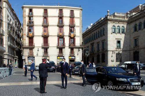 epa09469578 Spanish Prime Minister Pedro Sanchez (C) arrives ahead of his bilateral meeting with Catalan regional President Pere Aragones (not pictured) at Palau de la Generalitat, headquarters of the Catalan regional Government, in Barcelona, Spain, 15 September 2021. EPA/Enric Fontcuberta