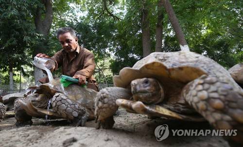 epa09469587 A Pakistani Caretaker cools off a turtle at a zoo in Karachi, Pakistan, 15 September 2021. Caretakers at Karachi's zoo were working to keep animals cool during a heatwave affecting southern Pakistan. EPA/SHAHZAIB AKBER