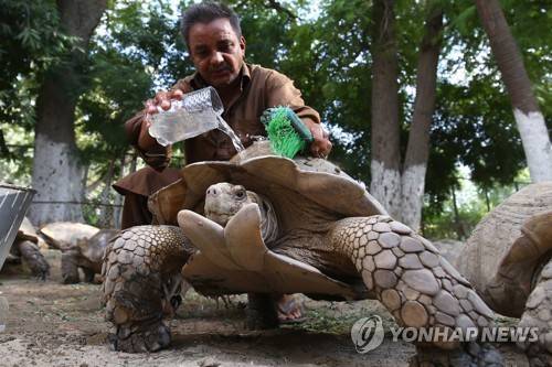 epa09469592 A Pakistani Caretaker cools off a turtle at a zoo in Karachi, Pakistan, 15 September 2021. Caretakers at Karachi's zoo were working to keep animals cool during a heatwave affecting southern Pakistan. EPA/SHAHZAIB AKBER