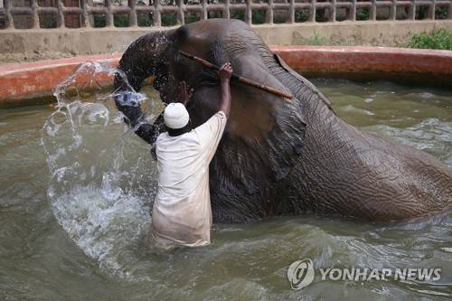 epa09469594 An elephant cools off at a zoo in Karachi, Pakistan, 15 September 2021. Caretakers at Karachi's zoo were working to keep animals cool during a? heatwave affecting southern Pakistan. EPA/SHAHZAIB AKBER
