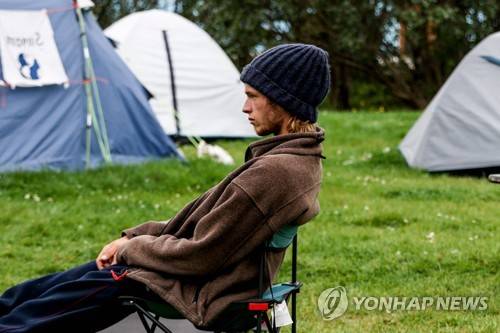 epa09469608 Hunger striking climate activist Simon Helmstedt rests at climate camp in Berlin's government district, Germany, 15 September 2021. Several climate activist are on hunger strike for climate protection and to obtain a meeting with the three German elections candidates for German chancellor. EPA/FILIP SINGER