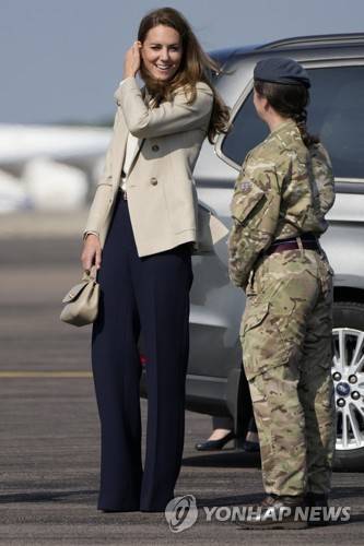 Britain's Kate, The Duchess of Cambridge meets military personnel as she arrives for a visit to RAF Brize Norton in Oxfordshire, England, Wednesday, Sept. 15, 2021. During the visit The Duchess will meet a number of those who supported the UK's evacuation of civilians from Afghanistan. (AP Photo/Frank Augstein)