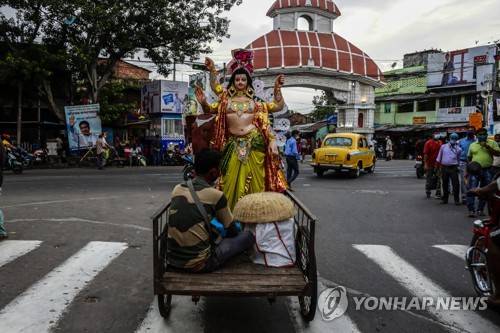 A clay idol of Hindu architect god Viswakarma is transported to its worship venue in Kolkata, India, Wednesday, Sept. 15, 2021. Hindu festival Vishwakarma Puja will be celebrated on Friday. (AP Photo/Bikas Das)