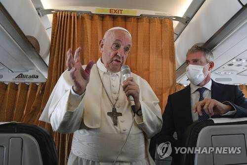 Pope Francis speaks with journalists on board an Alitalia aircraft enroute from Bratislava back to Rome, Wednesday, Sept. 15, 2021 after a four-day pilgrimage to Hungary and Slovakia. (Tiziana Fabi, Pool via AP) 12345678