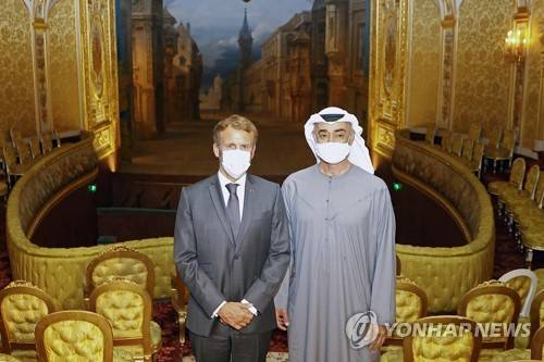 epa09469621 French President Emmanuel Macron (L) and Crown Prince of Abu Dhabi and Deputy Supreme Commander of the UAE Armed Forces, Sheikh Mohamed bin Zayed Al Nahyan (R), pose for photographs during their visit of the Imperial theatre of the Chateau of Fontainebleau, outside Paris, France, 15 September 2021. The two dignitaries visit the Fontainebleau Castle Imperial Theatre, restored after an agreement signed in 2007 between France and the Emirate of Abu Dhabi. EPA/IAN LANGSDON / POOL