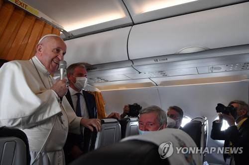 epa09469628 Pope Francis speaks with journalists aboard an Alitalia aircraft enroute back to Rome from Bratislava's Milan Rastislav Stefanik International airport in Bratislava, Slovakia, 15 September 2021. The pontiff ended his four-day apostolic journey to Slovakia. EPA/TIZIANA FABI / POOL