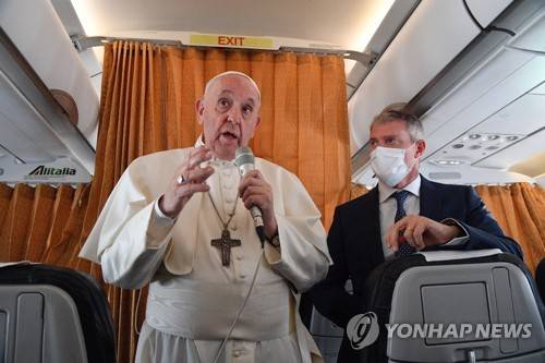 epa09469633 Pope Francis speaks with journalists aboard an Alitalia aircraft enroute back to Rome from Bratislava's Milan Rastislav Stefanik International airport in Bratislava, Slovakia, 15 September 2021. The pontiff ended his four-day apostolic journey to Slovakia. EPA/TIZIANA FABI / POOL