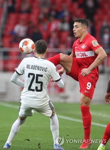 epa09469639 Ezequiel Ponce (R) of Spartak Moscow in action against Filip Mladenovic (L) of Legia Warsaw during the UEFA Europa League group C soccer match between Legia Warsaw and FC Spartak Moscow at the Spartak Stadium in Moscow, Russia, 15 September 2021. EPA/MAXIM SHIPENKOV