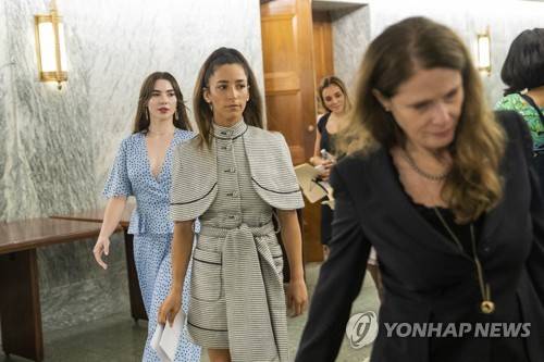 epa09469650 US Gymnasts Aly Raisman (2-L), McKayla Maroney (L) and Maggie Nichols (2-R) arrive for the Senate Judiciary Committee hearing on Dereliction of Duty: Examining the Inspector General's Report on the FBI's Handling of the Larry Nassar Investigation on Capitol Hill in Washington, DC, USA, 15 September 2021. EPA/SHAWN THEW