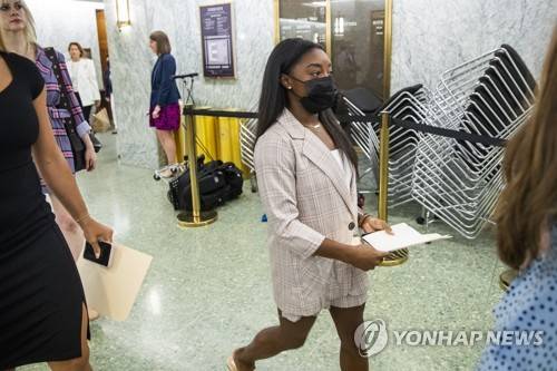 epa09469652 US Gymnast Simone Biles arrives for the Senate Judiciary Committee hearing on Dereliction of Duty: Examining the Inspector General's Report on the FBI's Handling of the Larry Nassar Investigation on Capitol Hill in Washington, DC, USA, 15 September 2021. EPA/SHAWN THEW