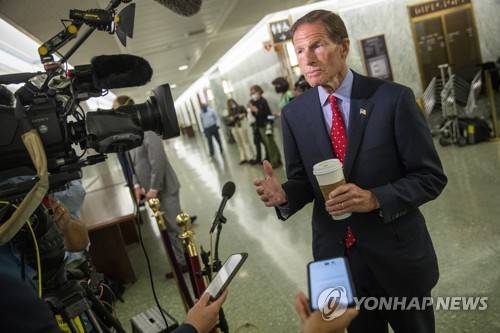 epa09469646 US Democratic Senator from Connecticut, Richard Blumenthal, responds to a question from the news media prior to the Senate Judiciary Committee hearing on Dereliction of Duty: Examining the Inspector General's Report on the FBI's Handling of the Larry Nassar Investigation on Capitol Hill in Washington, DC, USA, 15 September 2021. EPA/SHAWN THEW
