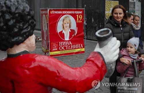 epa09469662 People walk past the poster of Communist party candidate to the Russian State Duma, Nina Ostanina, in Moscow, Russia, 15 September 2021. Elections of deputies of the State Duma, heads of 12 constituent entities of the Federation, and elections of deputies of legislative bodies of state power in 39 constituent entities of the Russian Federation, will take place on 19 September. However, according to the decision of the Central Election Commission, the elections will be held between 17 and 19 September 2021. EPA/YURI KOCHETKOV