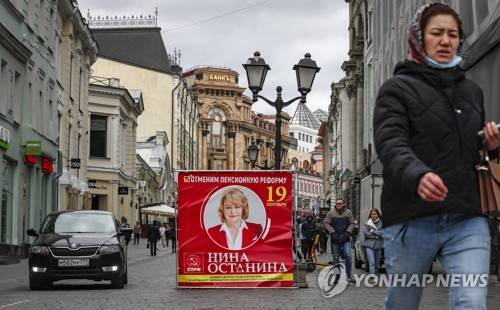 epa09469661 People walk past the poster of Communist party candidate to the Russian State Duma, Nina Ostanina, in Moscow, Russia, 15 September 2021. Elections of deputies of the State Duma, heads of 12 constituent entities of the Federation, and elections of deputies of legislative bodies of state power in 39 constituent entities of the Russian Federation, will take place on 19 September. However, according to the decision of the Central Election Commission, the elections will be held between 17 and 19 September 2021. EPA/YURI KOCHETKOV